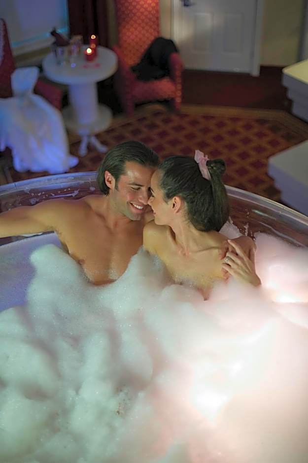 This spacious suite has a heart-shaped spa bath, private indoor heated pool, dry sauna, log burning fireplace and a round bed.